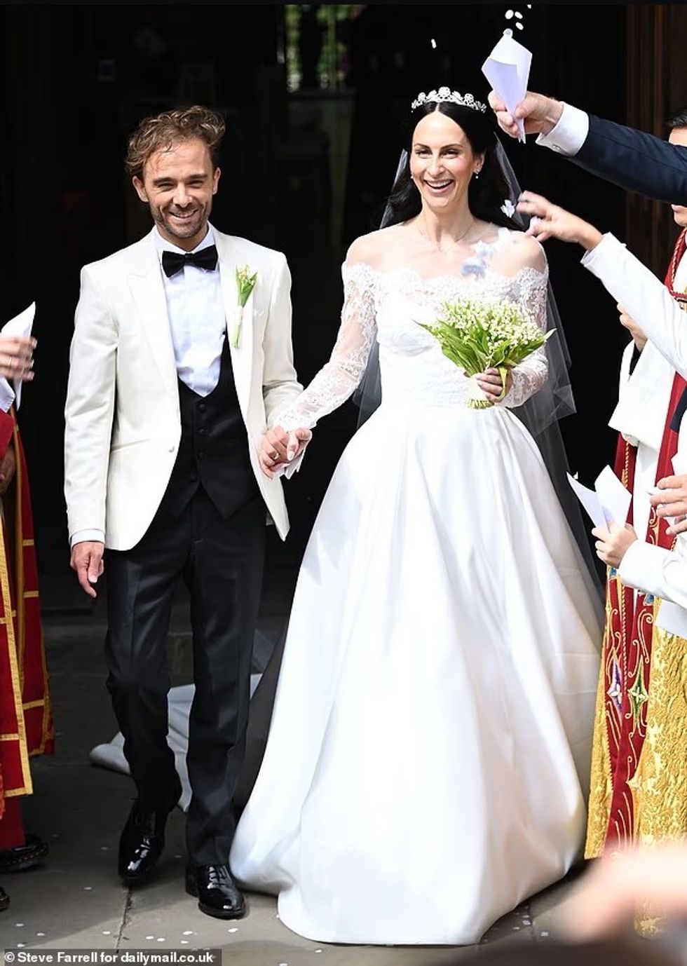 Çifti, i rrethuar nga miq, familjarë dhe kolegë, shkëmbyen puthje pasionante pas ceremonisë, ku mbi ta ranë konfeti të bardha.