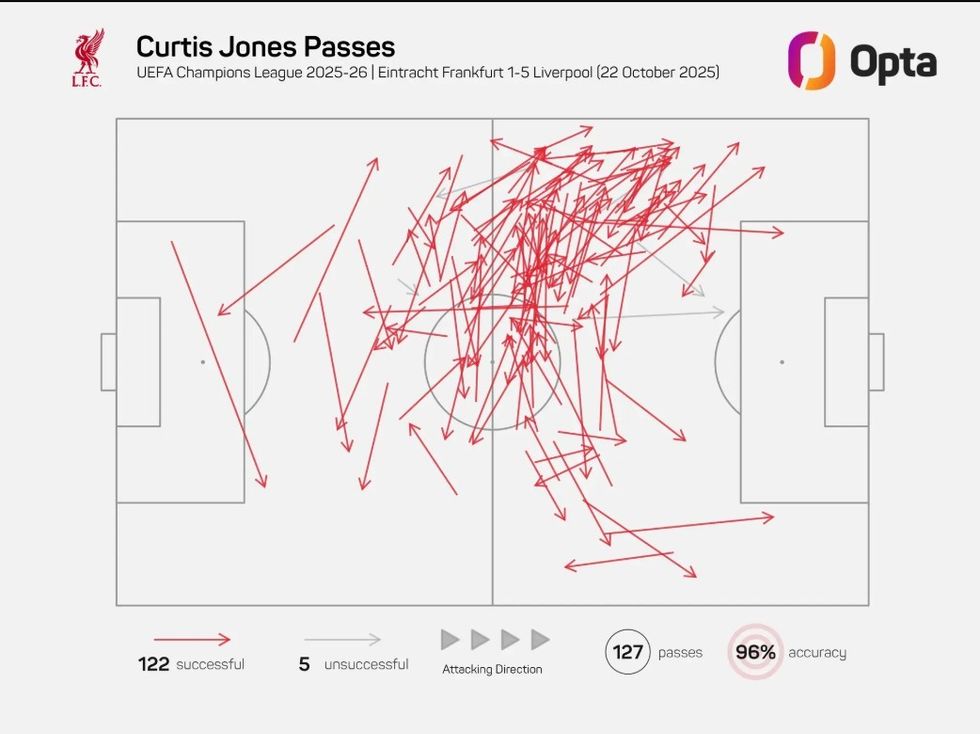 Jones tregoi gjithashtu saktësi të jashtëzakonshme me 96% pasime të sakta, u rendit si lojtari më i fauluar me dy shkelje, dhe fitoi 4 nga 7 duele në fushë, duke dëshmuar ndikimin e tij të gjithanshëm në fitoren e thellë të Liverpoolit.