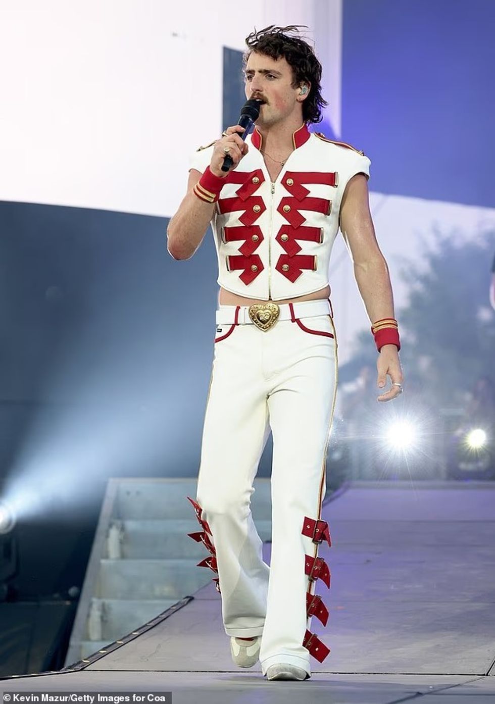 Skena e këngëtarit 23-vjeçar, e konceptuar si një platformë e gjatë dhe e ngritur, u bë menjëherë temë debati në rrjetet sociale për shkak të ngjashmërisë së saj të diskutueshme me një simbol nën brez.