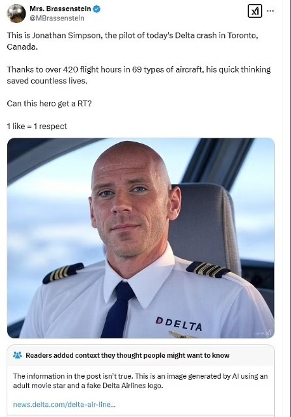 Një postim satirik nga një përdorues i X tregoi një imazh të Sins në uniformën e një piloti Delta me mbishkrimin: 'Ky është Jonathan Simpson, piloti i aeroplanit të rrëzuar të Delta-s në Toronto, Kanada.