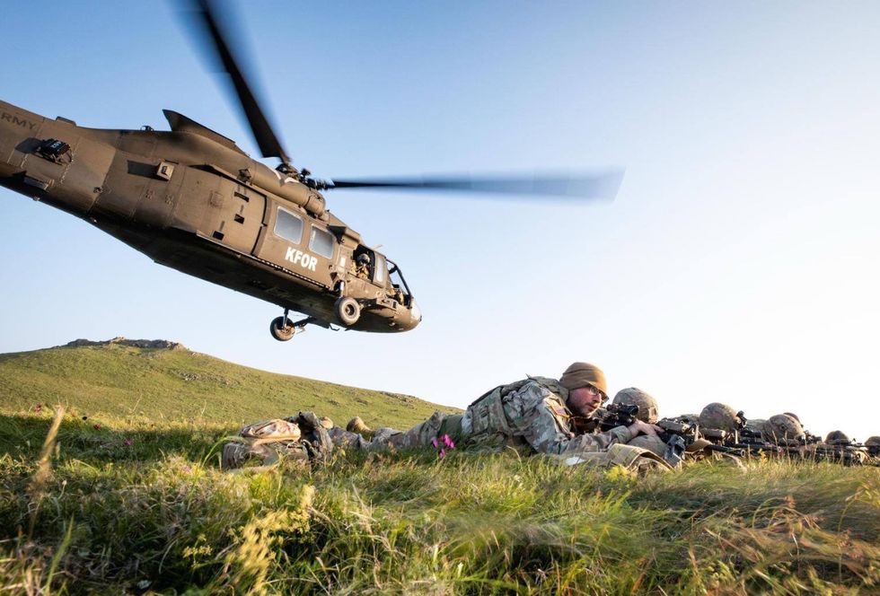 Ushtarët amerikanë të aviacionit, të caktuar në Komandën Rajonale Lindore të misionit KFOR, kryen një zbarkim ajror për trupat amerikane të këmbësorisë në mbështetje të një patrullimi në veri të Kosovës përgjatë vijës kufitare me Serbinë.