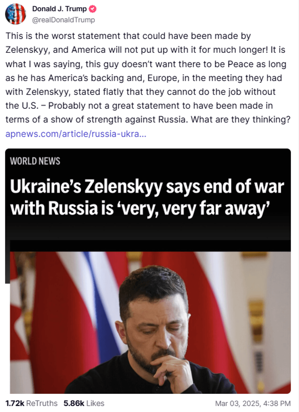 Duke folur në TruthSocial, presidenti amerikan tha se udhëheqësi ukrainas bëri "deklaratën më të keqe që mund të ishte bërë" kur tha se fundi i luftës me Rusinë është "shumë, shumë larg".