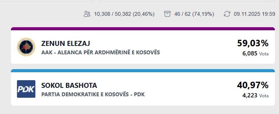 Rezultatet e përditësuara tregojnë se kandidati i Aleancës për Ardhmërinë e Kosovës (AAK), Zenun Elezaj, po ruan një epërsi të qartë me 59.03% të votave, që përfaqësojnë 6,085 vota.