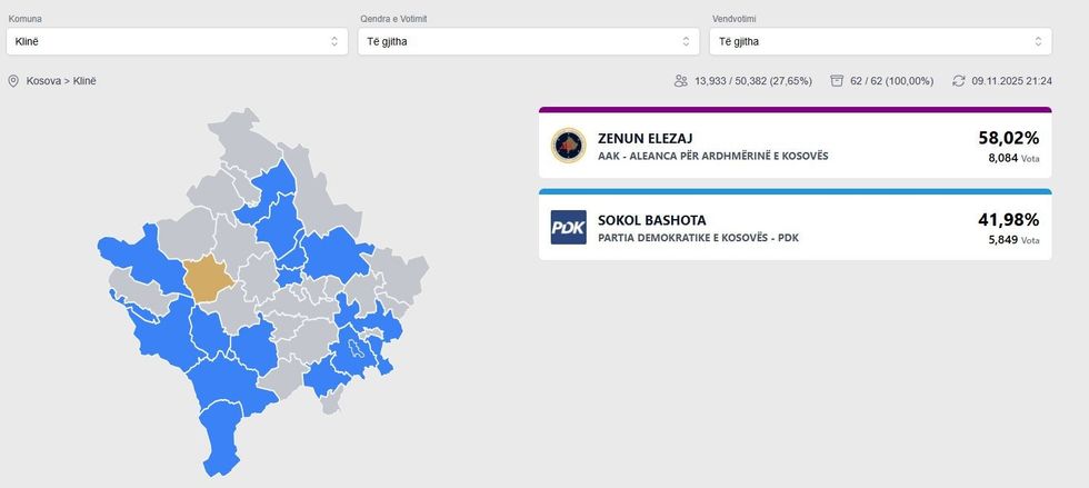 Procesi i numërimit të votave në komunën e Klinës po shkon drejt përfundimit, ndërsa sipas të dhënave më të fundit të publikuara nga Komisioni Qendror i Zgjedhjeve (KQZ), janë procesuar 46 nga gjithsej 62 vendvotime, ose 74.19% e totalit.