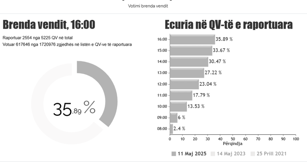 Pjesëmarrja në votime deri në orën 16:00 sipas Komisionit Qendror të Zgjedhjeve është 35.89%.