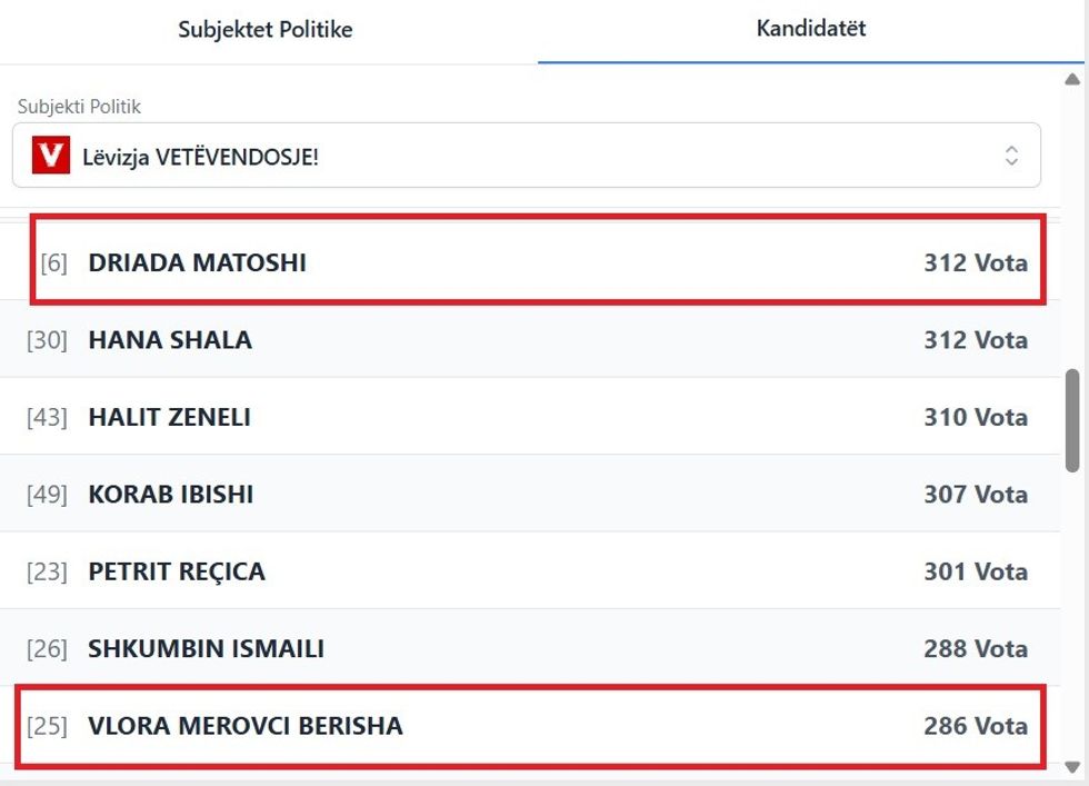 Sipas rezultateve preliminare, Driada Matoshi ka marrë gjithsej 312 vota, duke u renditur e 25-ta në listën e Vetëvendosjes, ndërsa Vlora Merovci ka siguruar 286 vota, që e vendosin të 31-tën në renditje.