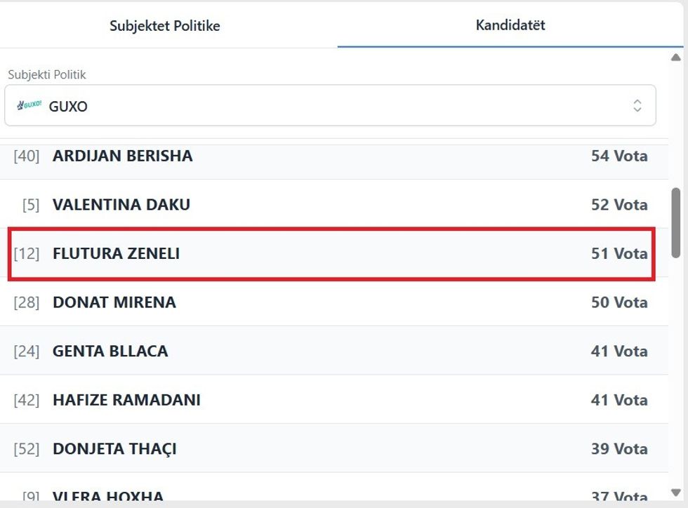 Ndërkohë, në listën Guxo, edhe aktorja Flutura Zeneli nuk arriti të sigurojë një mandat, duke marrë vetëm 51 vota, që e renditin të 18-tën në listën në të cilën ajo garoi.