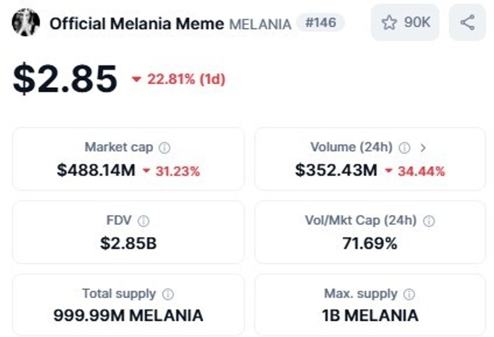 "Melania Meme", një tjetër kriptomonedhë e prezantuar javën e kaluar, ra në vlerë më shumë se gjysma gjatë një periudhe 24-orëshe që përfundoi mëngjesin e së enjtes.