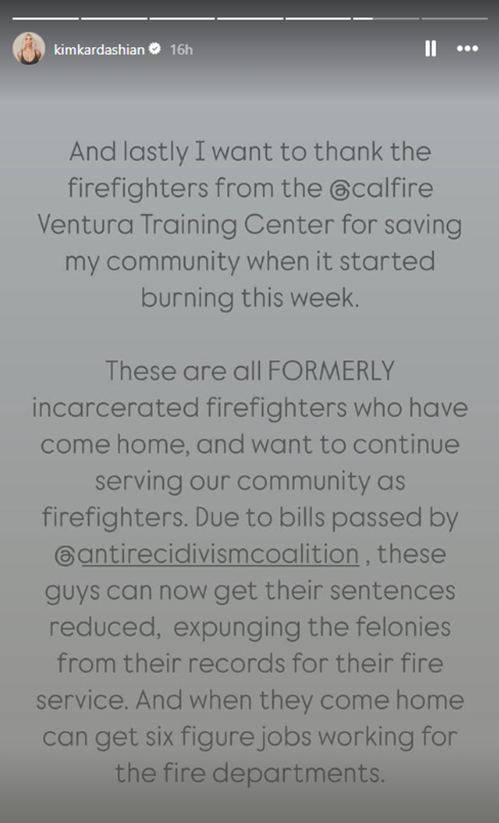 “Ata janë në zjarrin Palisades dhe zjarrin Eaton në Pasadena duke punuar 24 orë. Ata nuk paguhen pothuajse asgjë, rrezikojnë jetën e tyre, disa kanë vdekur, për t'i dëshmuar komunitetit se kanë ndryshuar dhe tani janë reaguesit e parë. Unë i shoh ata si heronj”.