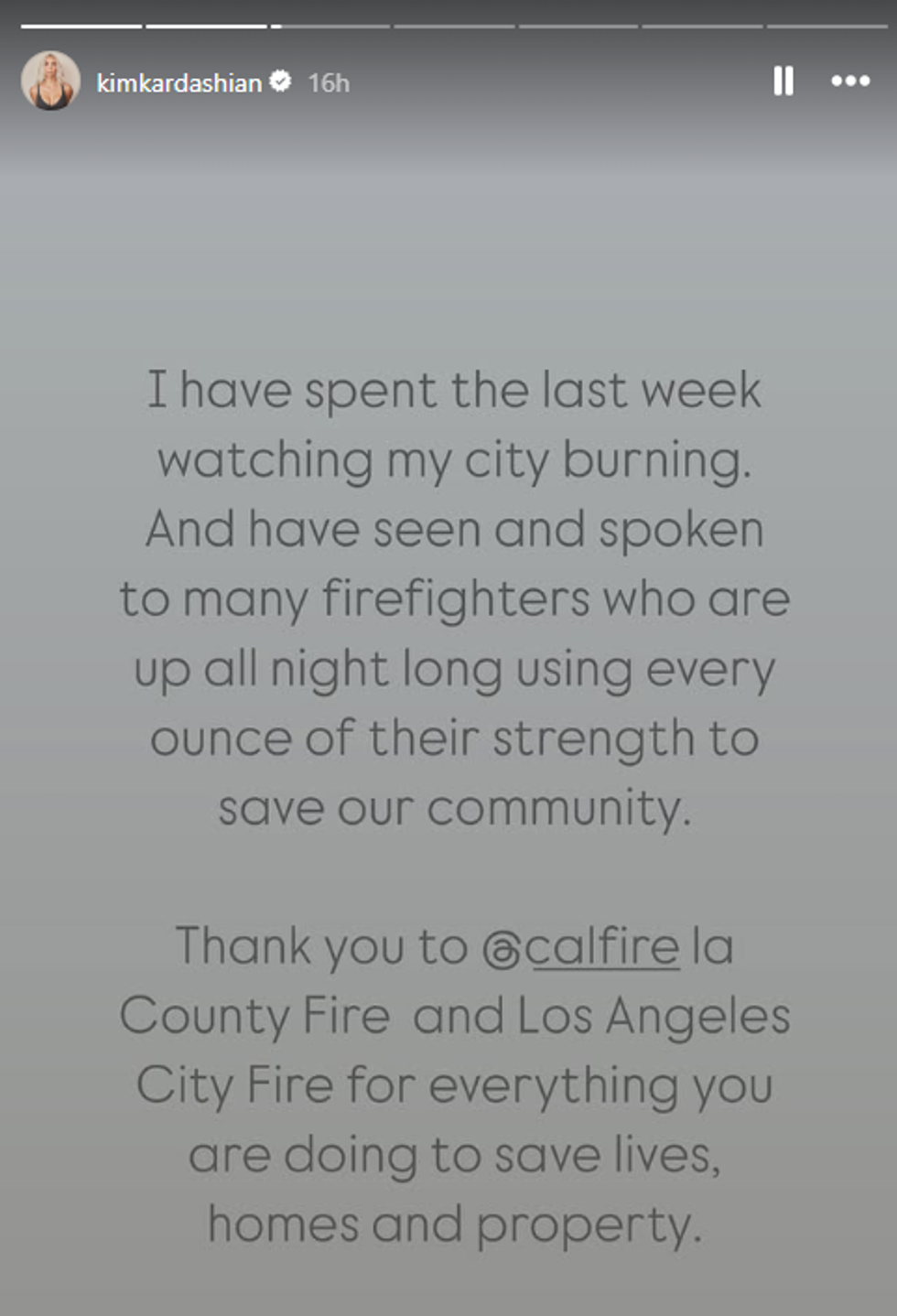 “Në të 5 zjarret në Los Angeles, ka qindra zjarrfikës të burgosur, që rrezikojnë jetën e tyre për të na shpëtuar”, shkroi ajo në Instagram.