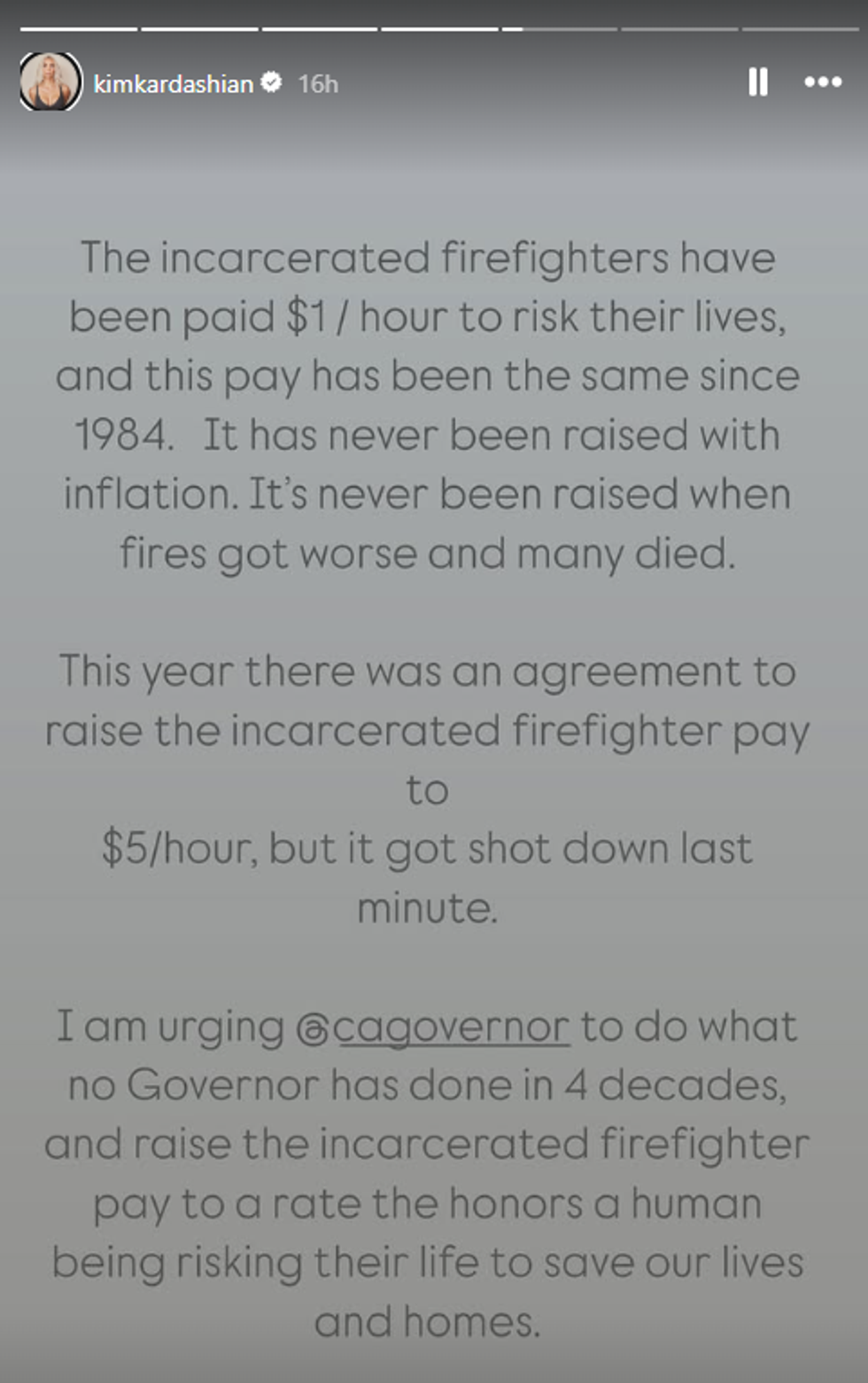 Kim Kardashian i bëri thirrje guvernatorit të Kalifornisë, Gavin Newsom, të rrisë pagën e zjarrfikësve që po luftojnë me zjarret shkatërruese në Los Angeles.