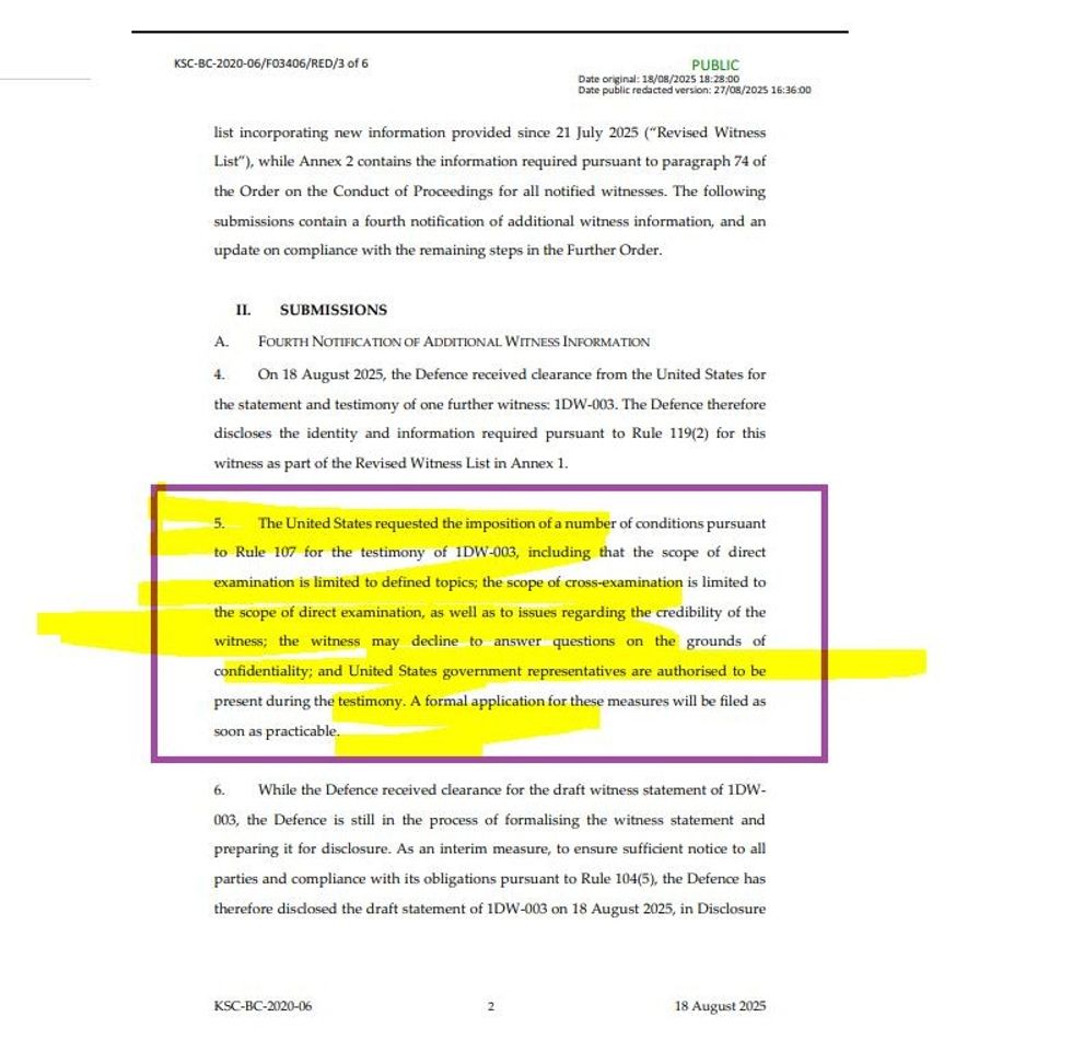 Sipas një dokumenti të Speciales, Shtetet e Bashkuara kanë kërkuar vendosjen e një sërë kushtesh për dëshminë e dëshmitarit të identifikuar si 1DW-003, duke u thirrur në Rregullën 107 të procedurës.